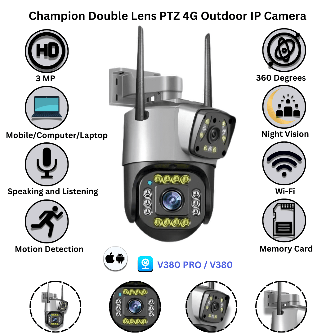 Champion Double Lens PTZ Outdoor WiFi IP Camera 3MP – 360° HD Security Cam with Night Vision & Motion Detection