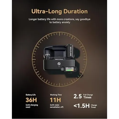 Hollyland Lark Max 2 Combo Each transmitter includes 8GB of internal storage, enabling up to 14 hours of backup recording — perfect for critical shoots where audio redundancy is essential. The 1.1″ OLED touchscreen on the receiver provides intuitive control and real-time audio monitoring. The entire system offers up to 22 hours of battery life with the included portable charging case, making it ideal for all-day shoots.