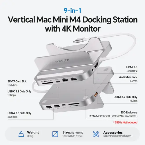 The PULWTOP BS212D Mac Mini M4 Vertical Dock is a multifunctional 9‑in‑1 expansion hub and vertical stand designed specifically for Mac mini M4 and M4 Pro users. Crafted with a premium aluminum alloy body that promotes efficient heat dissipation, this dock enhances your Mac mini’s connectivity and storage without adding clutter to your desk. Featuring a built‑in M.2 SSD enclosure compatible with both NVMe and SATA drives up to 4TB, the BS212D allows you to dramatically expand your storage capacity for large files, backups, and multimedia projects — all without the need for external drives.