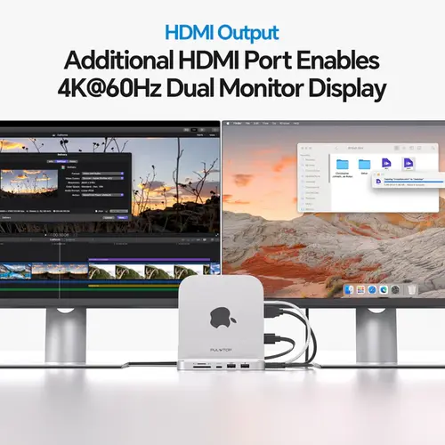With its sleek stand design, the PULWTOP BS212D not only saves valuable desk space but also helps improve airflow around your Mac mini, supporting better thermal performance during extended creative and productivity sessions. Whether you’re a professional content creator, designer, or everyday user seeking expanded connectivity and storage, this vertical dock transforms your Mac mini into a more capable and organized workstation.