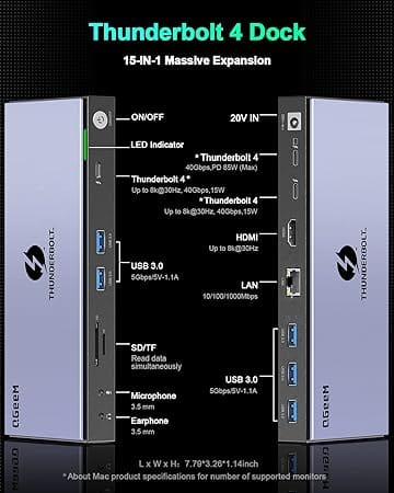 Supporting both macOS and Windows systems with Thunderbolt 4/3 or USB-C ports (with DisplayPort Alt Mode), it is a truly universal docking solution. The multi-port configuration includes four Thunderbolt 4 ports, HDMI, DisplayPort, Gigabit Ethernet, SD/TF card readers, combo audio jack, and multiple USB 3.0/2.0 ports to streamline your entire desktop setup.