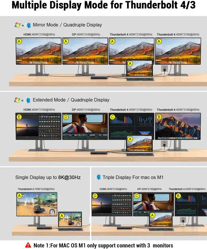| Video Output: | 1 x HDMI, 1 x DisplayPort, 3 x Thunderbolt 4 Downstream (supports up to Quad 4K@60Hz or Single 8K@30Hz) |
