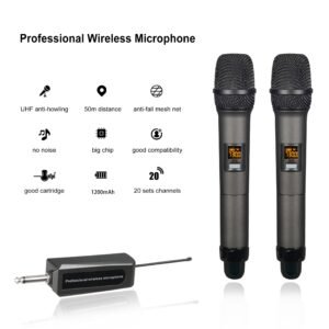 This wireless microphone system includes handheld dynamic microphones and a dedicated VHF receiver that connects easily to amplifiers, mixers, speakers, and karaoke systems through a 6.35mm audio output jack. The dual-channel capability allows smooth audio transmission and flexibility during performances.