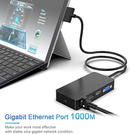 For networking, the Surface Pro Docking Station Hub includes a Gigabit Ethernet port (RJ45), supporting fast and stable wired internet speeds up to 1000 Mbps—ideal for downloading large files or video conferencing with minimal lag. Built-in SD and TF card slots offer fast access to media files from your camera or mobile device. An optional 5V Micro USB port provides extra power for demanding USB peripherals.