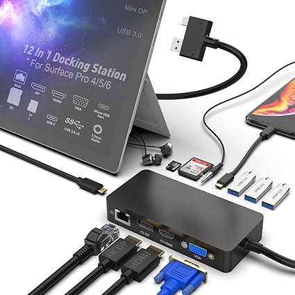 The Surface Pro Docking Station Hub is a multifunctional hub specially designed for Microsoft Surface Pro 4, 5, and 6, offering a seamless plug-and-play solution for users looking to expand their productivity setup. With a range of connectivity options including HDMI, DisplayPort, and VGA ports, this docking station enables triple display output, allowing you to extend or mirror your screen across up to three monitors.It features 3 USB 3.0 Type-A ports for high-speed data transfer (up to 5Gbps) and reliable connections for peripherals like a mouse, keyboard, or external drive. A 3.5mm headphone jack allows you to enjoy your favorite music or media using wired headphones (note: microphone not supported).