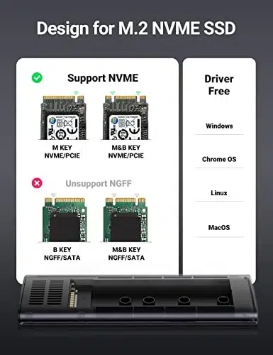 The UGREEN CM400 M.2 NVMe SSD Enclosure offers a high-speed storage solution with USB 3.1 Gen 2 interface, enabling data transfer rates up to 10Gbps. Designed for users who demand speed and reliability, this enclosure supports M.2 NVMe SSDs with M-Key and M+B Key connectors in sizes 2230, 2242, 2260, and 2280, with capacities of up to 2TB.