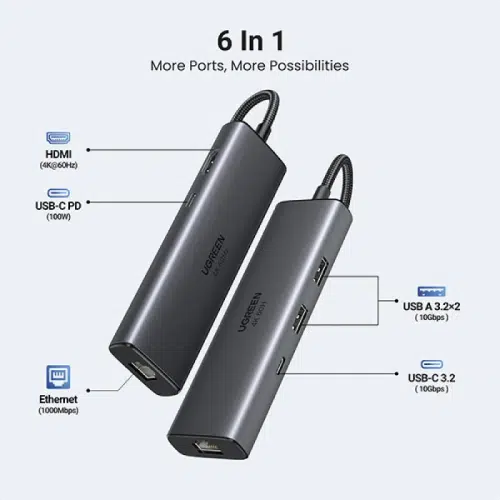 The Ugreen CM512 6in1 Type C Docking Station is an excellent accessory for expanding the connectivity options of your USB Type-C devices. Designed with versatility and style in mind, this multifunction hub includes one USB Type-C 3.1 Gen 1 port, three USB-A 3.1 Gen 1 ports, an HDMI port supporting 4K@30Hz resolution, and a Type-C PD port that delivers up to 60W of power—perfect for charging while in use.