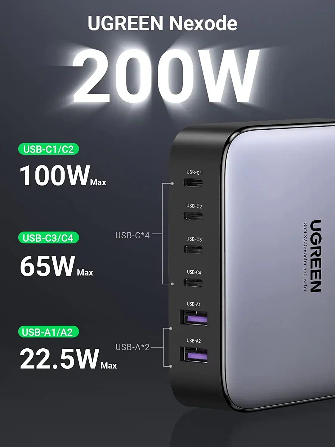 The UGREEN Nexode 200W USB‑C GaN Desktop Charger is a compact yet powerful 6-port desktop charger designed to meet the demands of professionals, students, and tech enthusiasts. Featuring 4 USB-C and 2 USB-A ports, it delivers a total output of up to 200W, making it capable of charging high-power devices like a 16-inch MacBook Pro in just 1.5 hours.