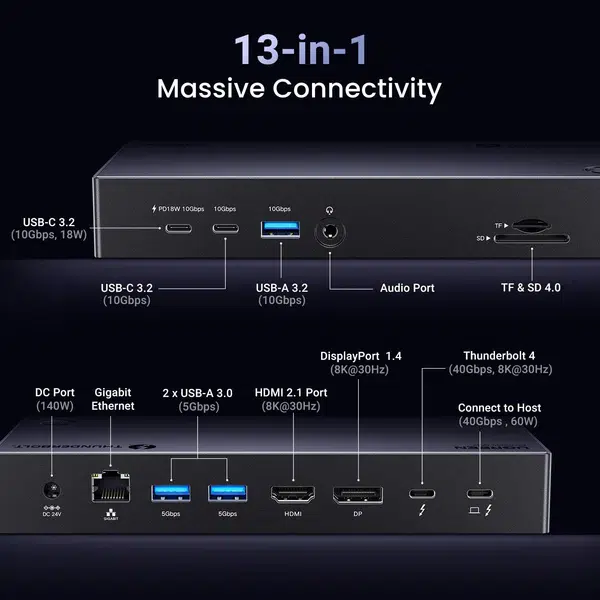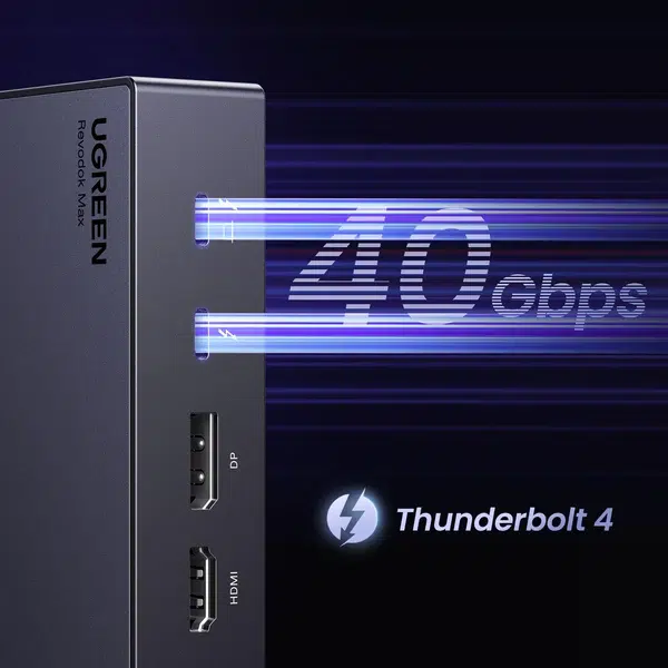 In summary, the UGREEN Revodok Max313 Thunderbolt 4 13in1 Docking Station is the perfect solution for anyone looking to turn a single Thunderbolt port into a full-featured workstation. Its elegant design, extensive port selection, and high-speed capabilities make it a reliable and efficient addition to any modern desk setup.