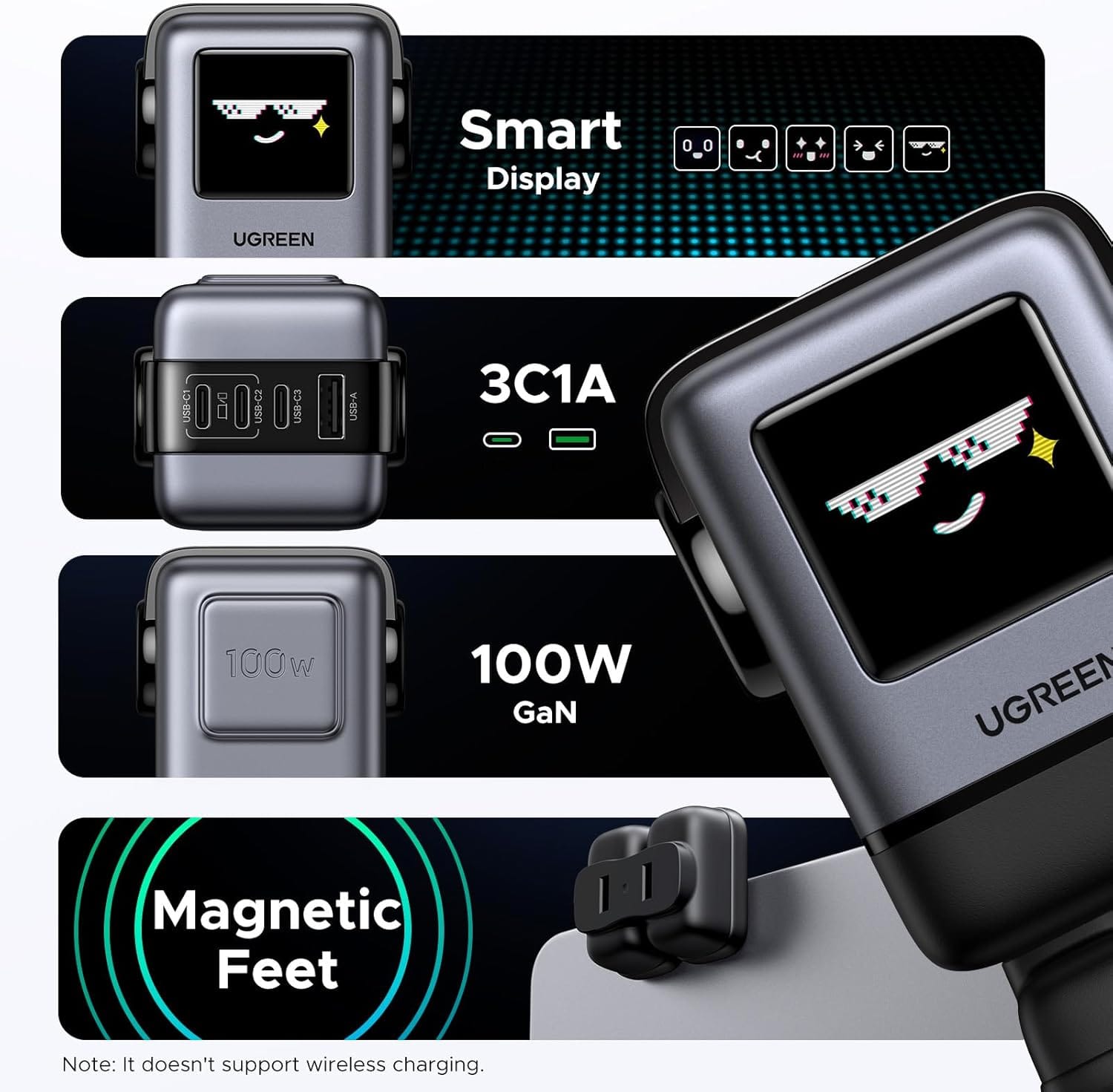 The UGREEN X688 Uno 100W GaN Fast Charger is an innovative and stylish charging device shaped like a robot, offering powerful performance with a fun twist. Featuring a bright TFT display, the charger shows different emotions based on the charging status—making it not just functional but also engaging to use. With its clever magnetic feet, it can be easily attached to your laptop or workspace for convenience and portability.