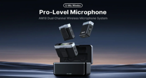 the U-Mic AM18 provides stable wireless connectivity in both indoor and outdoor environments. The system supports three recording modes—Mono, Stereo, and Safety Track—ensuring audio clarity, versatility, and redundancy for professional-quality recordings. Each transmitter includes 8GB of onboard storage, offering up to 14 hours of backup audio in case of wireless dropouts.  Battery performance is strong, delivering up to 14 hours per transmitter and up to 20 hours total with the included charging case, making it suitable for long shoots or outdoor use.