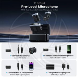 The receiver’s TFT touchscreen simplifies setup and monitoring, while compatibility with 3.5 mm TRS, USB-C, and Lightning outputs ensures broad support across cameras, smartphones, tablets, and computers.  Included windproof furry covers help reduce wind noise during outdoor recording, and the compact, wearable design with integrated clips makes the system easy to transport and attach. Whether you’re creating vlogs, shooting interviews, producing podcasts, or capturing live events, the Ulanzi U-Mic AM18 Dual Wireless Lavalier Microphone delivers flexible, high-quality audio with practical features suited for modern content workflows.