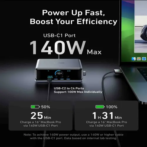 The USB-C1 port supports up to 140W output, making it suitable for high-performance laptops, while the remaining USB-C ports provide up to 100W each for tablets, phones, and other accessories. The USB-A ports deliver up to 22.5W for efficient charging of legacy USB devices. Intelligent power distribution automatically adjusts power delivery depending on connected devices, ensuring optimal charging performance.