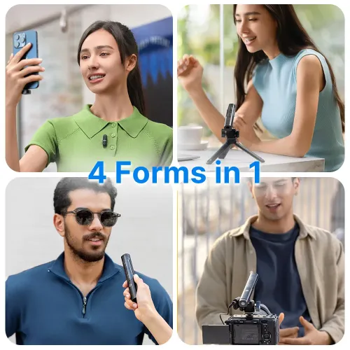 The transformable design allows flexible usage, adapting easily to different recording scenarios. Its omnidirectional microphone captures sound from all directions, ensuring natural voice pickup and consistent audio quality. With its simple plug-and-play functionality, users can quickly connect it to smartphones, cameras, tablets, or laptops without complicated setup.