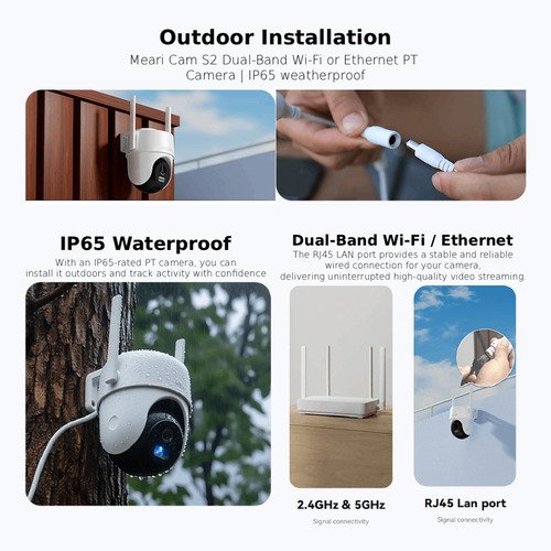 For night monitoring, the Meari S2 Plus supports both infrared night vision up to 30 meters and full-color night vision, ensuring clear footage even in complete darkness. The built-in microphone and speaker enable two-way audio communication, allowing users to listen and speak through the camera remotely via mobile app. The camera features smart AI-based functions such as motion detection, auto-tracking of moving objects, human detection, and siren alarm alerts to enhance security response and reduce false alarms. With dual-band WiFi (2.4GHz & 5GHz) along with an Ethernet port, it ensures stable and flexible connectivity options.