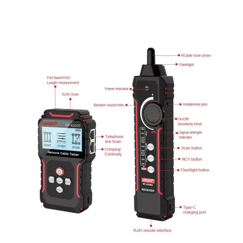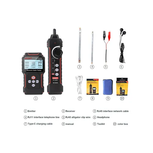 The receiver unit includes NCV (non-contact voltage detection), adjustable sensitivity, LED indicators, and audio output via headphone jack for enhanced usability in noisy environments. Powered by a rechargeable lithium battery, the NF-8209S is built for long working hours and field reliability. Overall, the Noyafa NF-8209S is an all-in-one network diagnostic solution ideal for professionals who need fast, accurate, and versatile cable testing and troubleshooting capabilities.