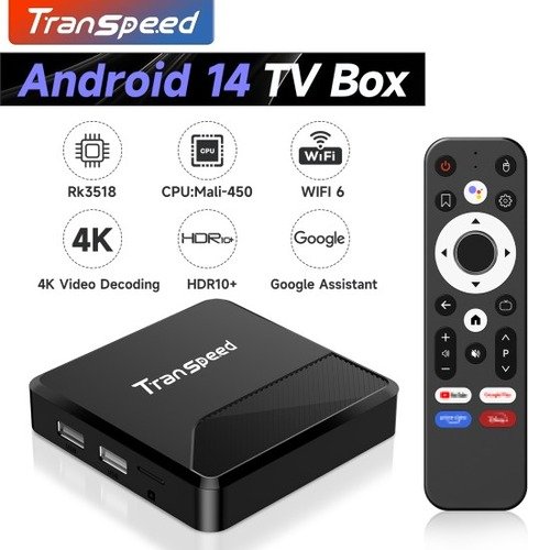 The TRANSPEED X88 Mini TV Box is a compact media player designed to deliver high-quality 4K entertainment for your home. Powered by an RK3518 Quad-Core 64-bit Cortex-A53 chipset and Mali-G31 MP2 GPU, it ensures smooth video playback, streaming, and casual gaming. With 2GB DDR3 RAM and 16GB eMMC storage, the device runs Android 14 efficiently, supporting apps, media, and streaming services.