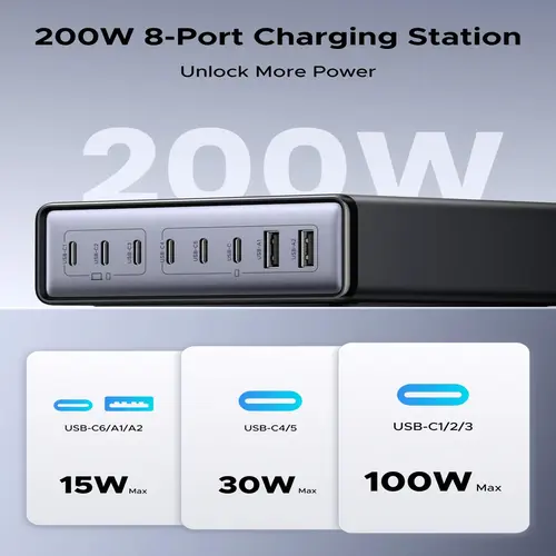 - 8 Ports (6 x USB-C PD, 2 x USB-A)