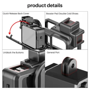 The Ulanzi G9-4 Vlogging Cage is a versatile and durable accessory designed specifically for GoPro Hero 9, 10, 11, and 12,13 action cameras. Built with a combination of aluminum alloy and ABS materials, this cage provides enhanced protection while maintaining a lightweight and compact form factor ideal for vloggers and content creators.